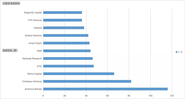 其他挤进前 10 的投资机构有 a16z 约 47 笔;Alameda Research 约 46 笔;成立于 2013 年的老牌做市商 GSR 今年在投资领域也异常活跃,凭借着约 44 笔的投资数量力压众多老牌投资机构,并向由 Binance 牵头的行业复苏基金提供 500 万美元的资金支持,GSR 热衷投资的赛道有 DeFi、GameFi 等;Jump Crypto 约 43 笔;Solana Ventures 约 42 笔;Hashed 约 38 笔;FTX Venture(否认与 Alameda Research 合并投资业务)约 36 笔;Dragonfly Capital 约 36 笔。