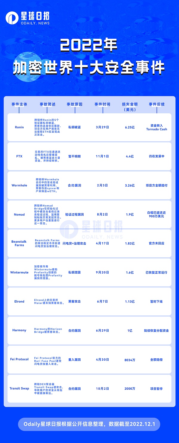 截至 2022 年 11 月末,区块链生态发生的相关典型安全事件数量超过 164 起,经济损失约 38.23 亿美元。其中损失金额前十的事件主体分别是 Ronin、 FTX、Wormhole、Nomad、Beanstalk Farms、Wintermute、Elrond Harmony、Fei Protocol和Transit Swap,详见下图。
