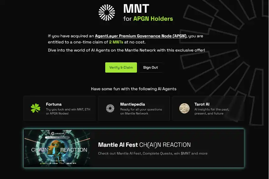 此外,AgentLayer 的节点持有者 APGN(AgentLayer Premium Governance Node)用户已经可以领取空投的 MNT(免费申领 2 MNTs)作为参与回馈。值得一提的是,AgentLayer 在此次活动中特别放置了总价值超 2 万 USDT 的 20 个 APGN 节点作为抽奖奖励。同时,所有参与者还有机会获得 APGN 节点购买的折扣券。APGN 节点持有者在活动中尽享三倍权益,如在 Fortuna 中支付一次可得 3 次抽奖机会,在 Tarot AI 支付一次得 9 次对话,在 Mantlepedia 支付一次得 9 次互动机会。