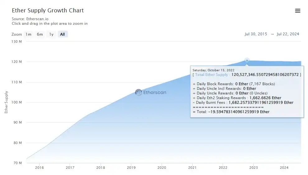 与此同时,自从以太坊合并转向权益证明(Proof of Stake)以来,以太坊的供应量略有减少,如下图所示。
