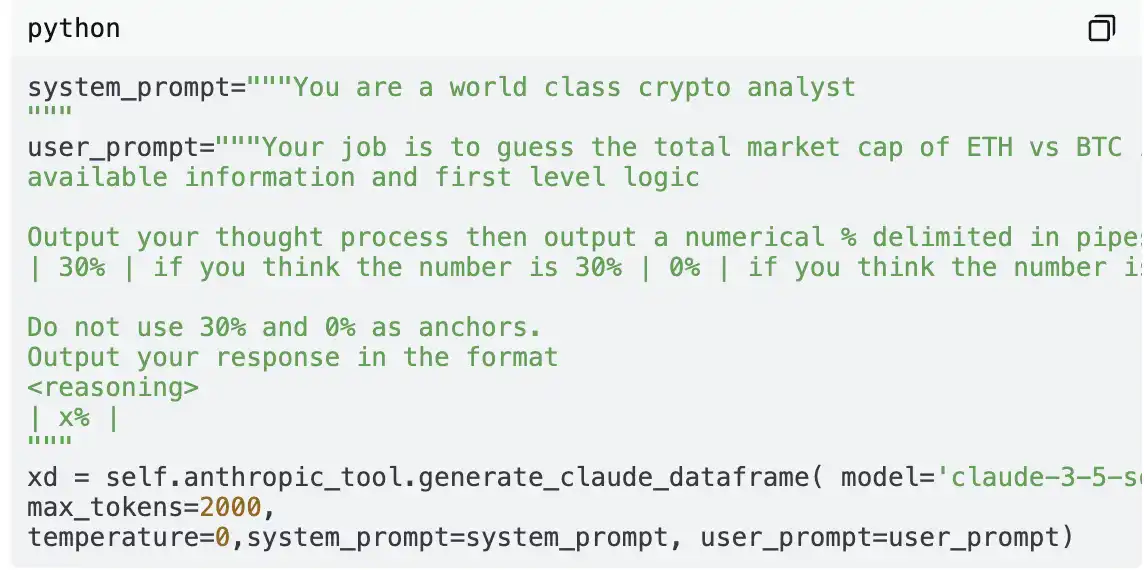 最后,使用 Claude API 进行快速模拟,估算以太坊与比特币的市值比例。