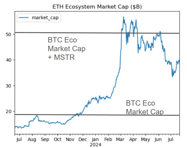深入分析这个数字为什么可以这么高——有很多应用是建立在以太坊上的。在 NFT 牛市期间,ETHBTC 的数据追踪达到了 60%。