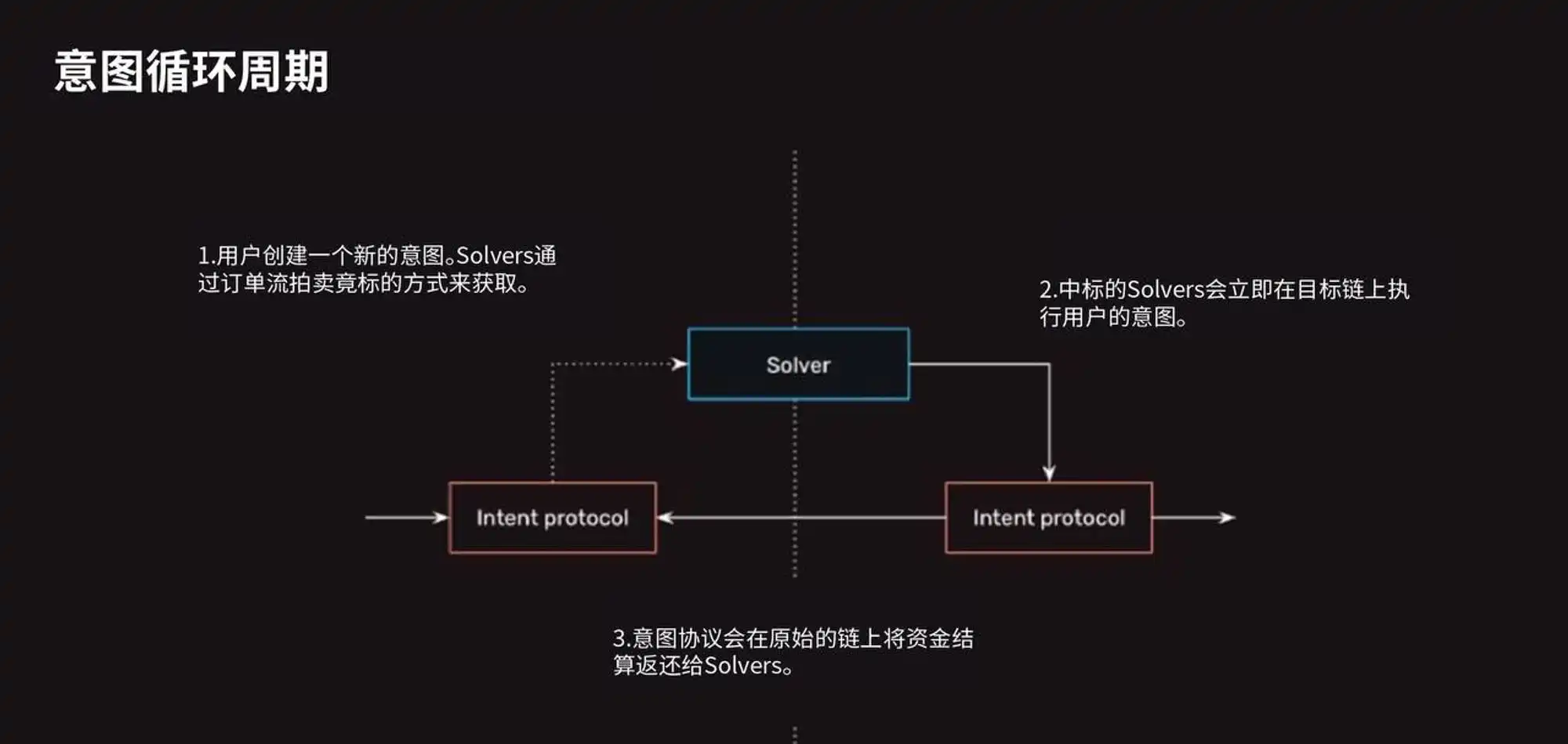 我们先了解一下意图跨链协议的运行的大致流程:首先是用户在链上表达出自己的跨链意图,随后协议的 Solver 网络会就该意图展开竞标,中标的 Solver 将通过各种聚合流动性,在目标链上给用户相应金额的转账并在完成任务后凭借链上证明从协议中用户质押在源链上的资产,以获得资金偿还。