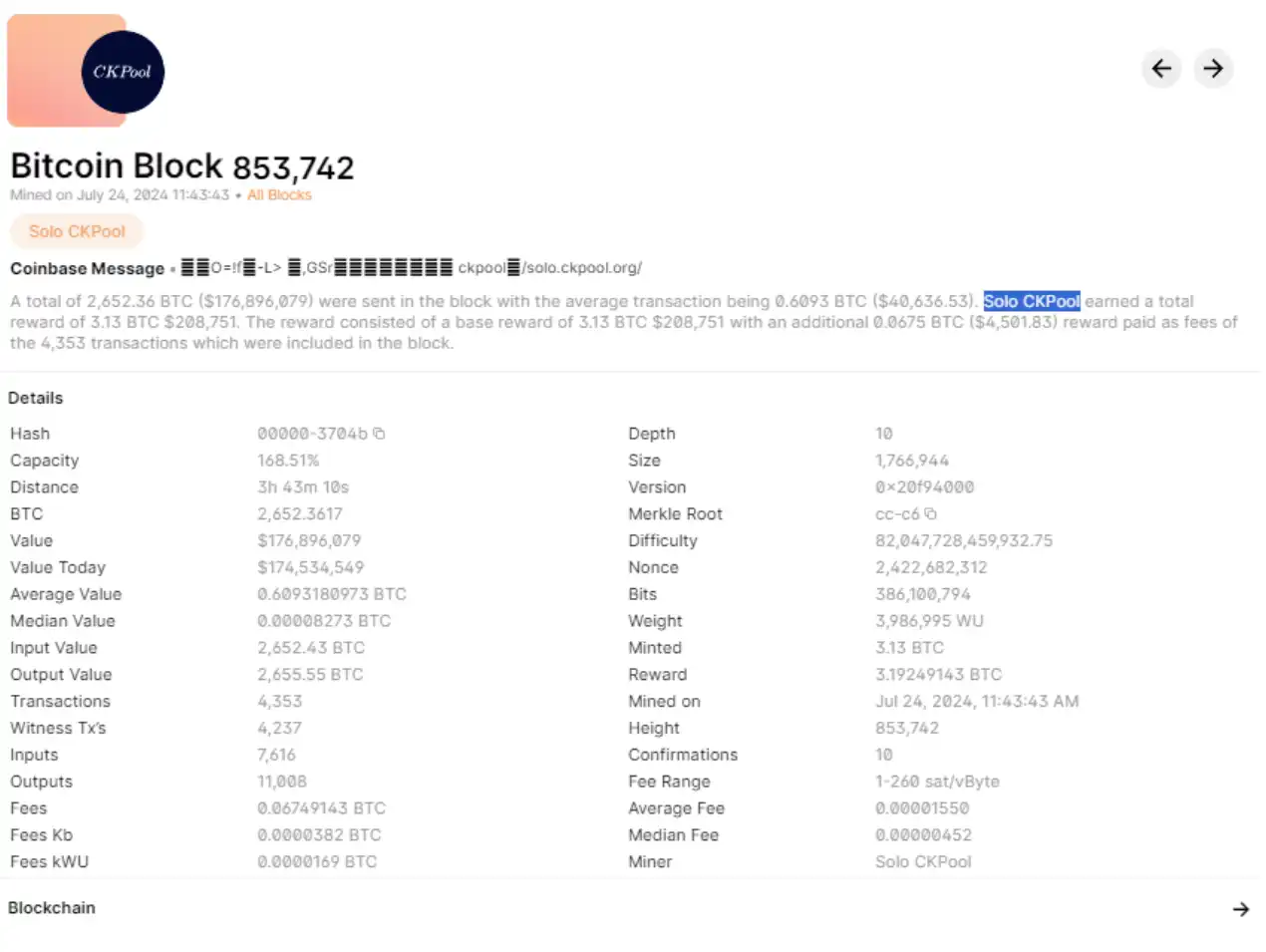 链上数据显示,CKPool 在台湾时间 7 月 24 日晚上 7:43 挖出比特币区块 853742,而该区块就是由算力仅 500 Gh/s 的 Bitaxe 挖出,这名矿工处理了包含 4365 笔交易的这一区块,并获得 3.19 枚 BTC 奖励。