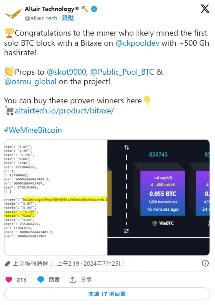 比特币挖矿设备零售商 Altair Technology 在今(25)日发布公告指出,一台算力仅有 500 Gh/s 的比特币微型矿机 Bitaxe,在 24 日成功打包一个区块,依照当前比特币价格计算,获得价值约 206,000 美元的 3.19 枚比特币(区块奖励+手续费):