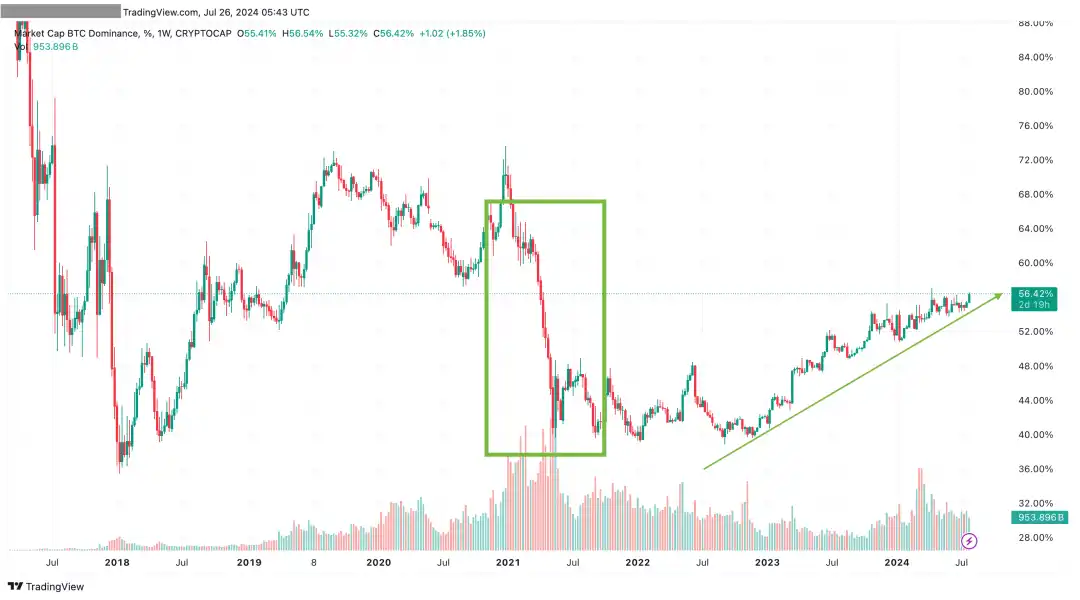 目前还是处在比特币季,该指数从今年初以来一直在上升,截止 7 月 26 日 56%,山寨币的表现仍不及比特币,所以比特币占主导地位。