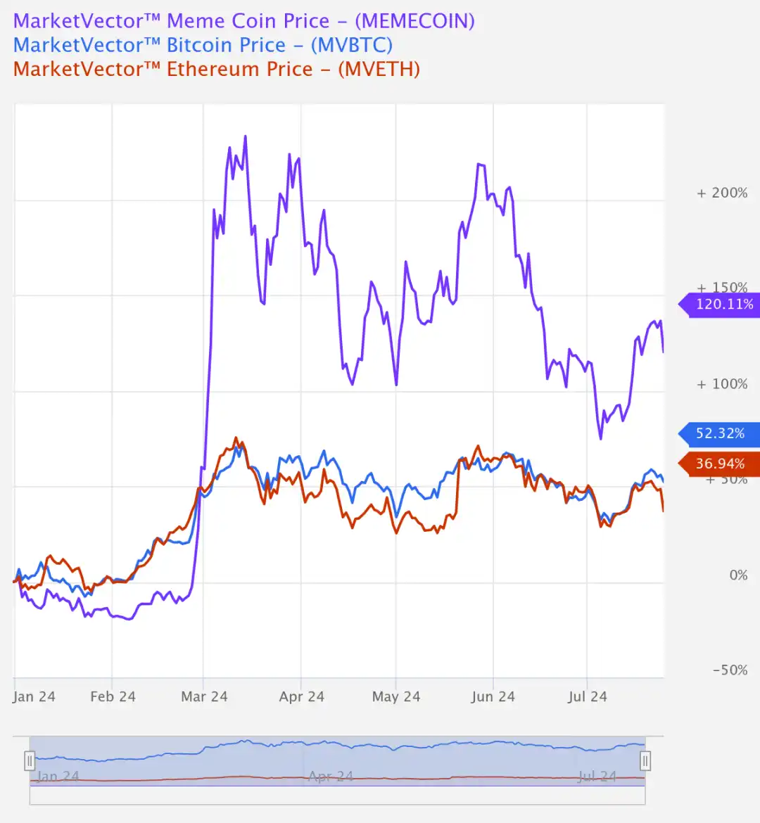 通过对比可以看出年初至今 Meme 币表现实在太抢眼,以 120% 涨幅超过,52% 涨幅的 BTC 和 37% 涨幅的 ETH。