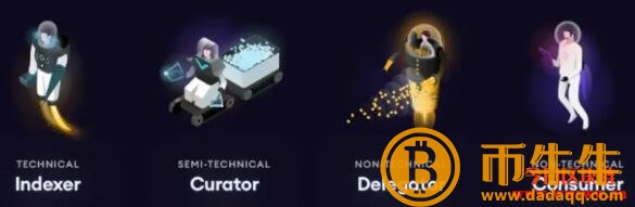 图形网络中有四个角色。主动索引器、管理器和委托器可以从这个数据网络中获得与GRT锁数量成比例的收入。消费者支付GRT令牌来查询数据。