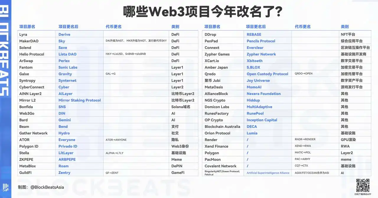 纵观加密周期更迭,项目更名、合并、或者代币换名等操作屡见不鲜。据律动 BlockBeats 不完全统计,仅今年以来涉及到协议、项目或者代币名变更或合并的项目就多达 40 余个。除 MakerDAO 外,还有 Galxe(现更名 Gravity)、Helio Protocol(现Lista DAO)、Polygon(代币名变为 POL)等知名协议和平台都进行了名称(或代币)的变更。
