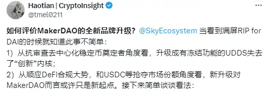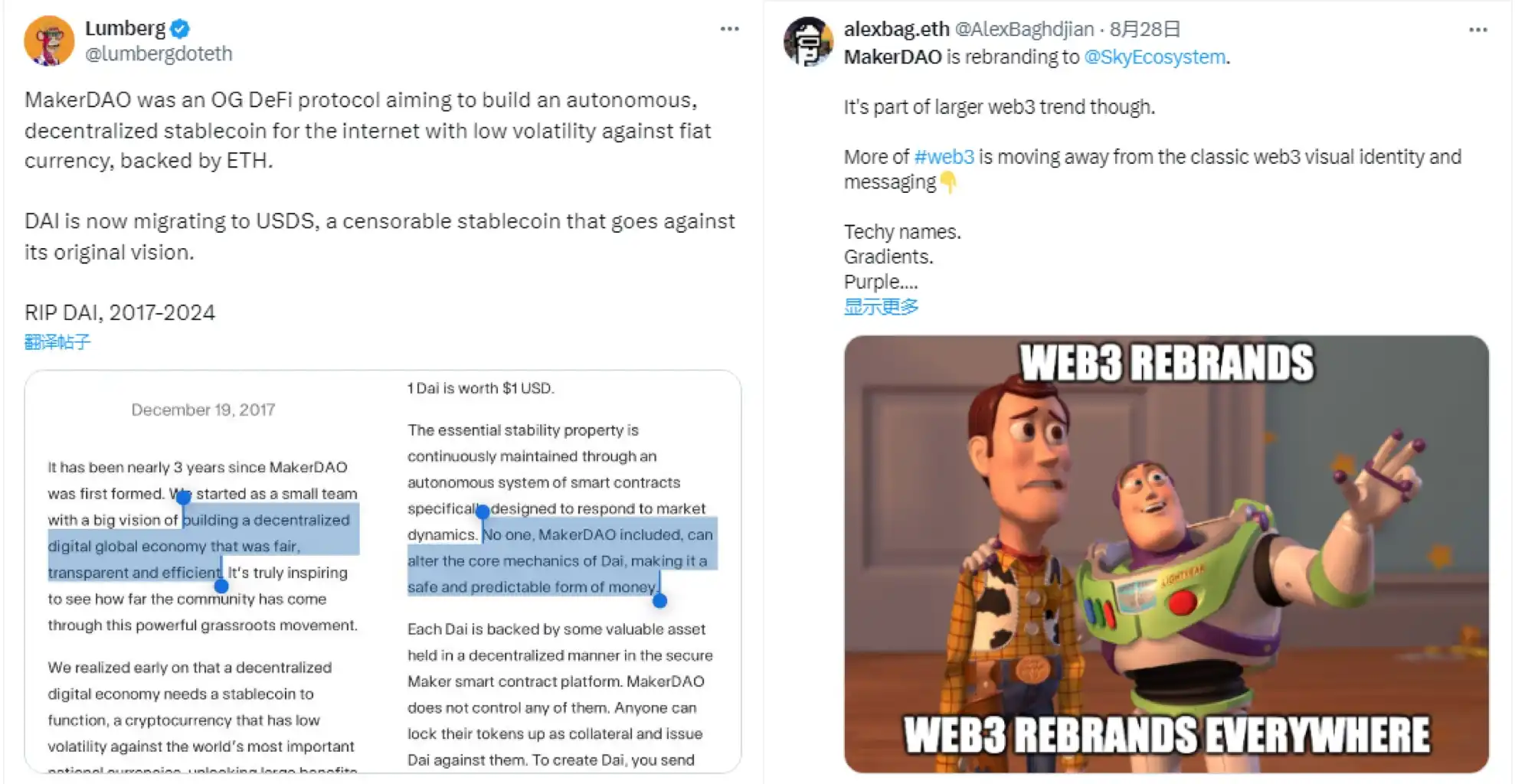 上周,MakerDAO 正式更名为 Sky Protocol,并将把自己的代币和稳定币升级为 SKY 和 Sky Dollar(USDS)。此举引来不少老用户的「diss」,除了吐槽团队不专业、原 X(推特)账号没有妥善处理外,更多人认为新名字毫无特色,甚至失去了 Web3 的特点,更像一家 Web2 科技公司,不如 MakerDAO 令人印象深刻;还有 KOL 直言团队已经违背了去中心化的愿景。
