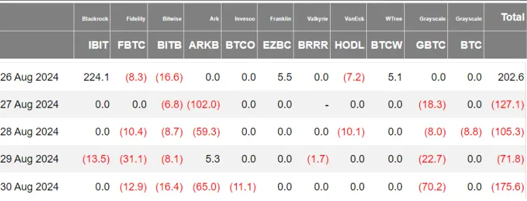 上周,美国比特币现货ETF净流出2.77亿美元,大部分ETF出现了显著的资金流出。贝莱德IBIT于8月29日净流出1350万美元,这是该基金历史上的第五次流出,且流出量排名第二。