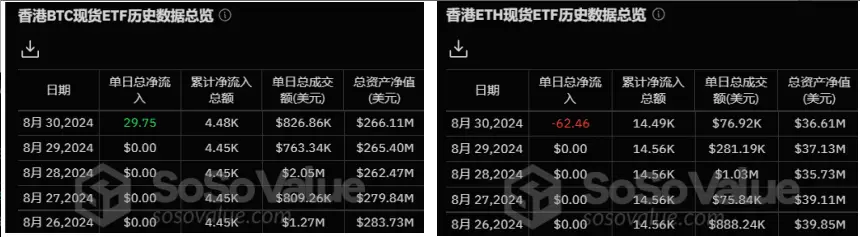 上周,香港比特币现货ETF净流入29.75枚比特币,总资产净值达2.66亿美元。以太坊现货ETF则净流出62.46枚ETH,总资产净值为3661万美元。