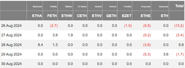 灰度ETHE净流出2780万美元,目前的抛售量仅为初期的八分之一,或意味着灰度的抛压接近尾声。贝莱德ETHA在8月28日净流入840万美元,其余四日无任何资金流动。