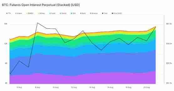 根据coinglass的数据,从8月21日至22日,比特币期货的未平仓合约(open interest,oi)在短短24小时内增加了20亿美元,达到320.8亿美元。这一变化标志着新资金的强劲涌入,反映出交易者们对市场未来的信心。