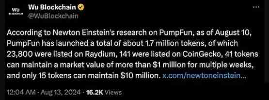 截至 8 月 10 日,PumpFun 上共发行了 170 万个代币。来源:X