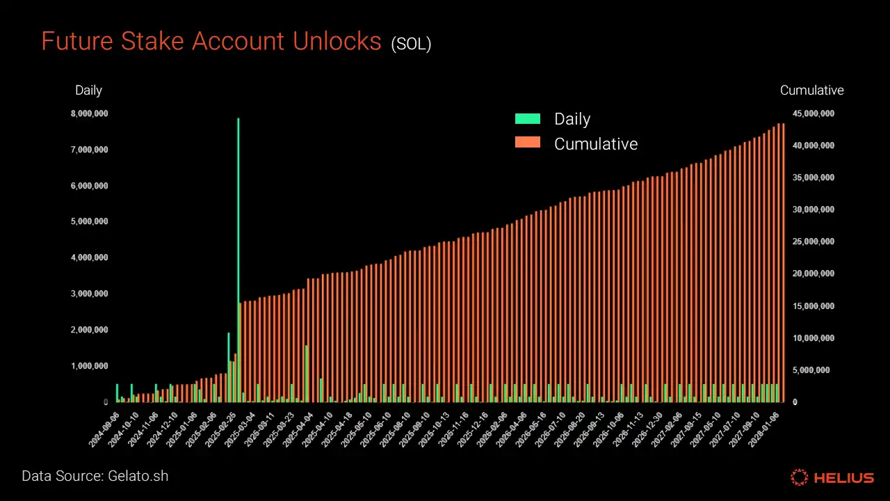 目前至少有 4350 万 SOL 代币仍在锁定质押账户中,占当前供应量的 7.5%。其中包括在今年早些时候 FTX 资产破产程序期间出售给大型行业实体(如 Galaxy Digital 和 Pantera)的 4100 万 SOL 代币。一些公司,如 Neptune Digital Assets,公开宣布了他们的购买详情——Neptune 以每枚 64 美元的价格购买了 26,964 枚 SOL。这些代币中的 20% 将在 2025 年 3 月解锁,剩余部分将以每月线性解锁的方式,持续到 2028 年初。这一解锁时间表与链上锁定质押账户数据一致(见图表)。