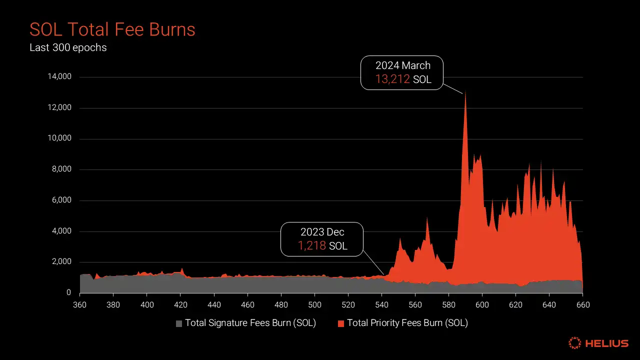 从 2023 年 12 月 10 日的 Epoch 544 开始,优先费用出现了明显的转折点。最高的总费用销毁量出现在 Epoch 590(2024 年 3 月 18 日开始),总计销毁了 13,212.31 枚 SOL。在最近的 100 个 epoch 中,平均每个 epoch 的总费用销毁量为 5,372.16 枚 SOL。