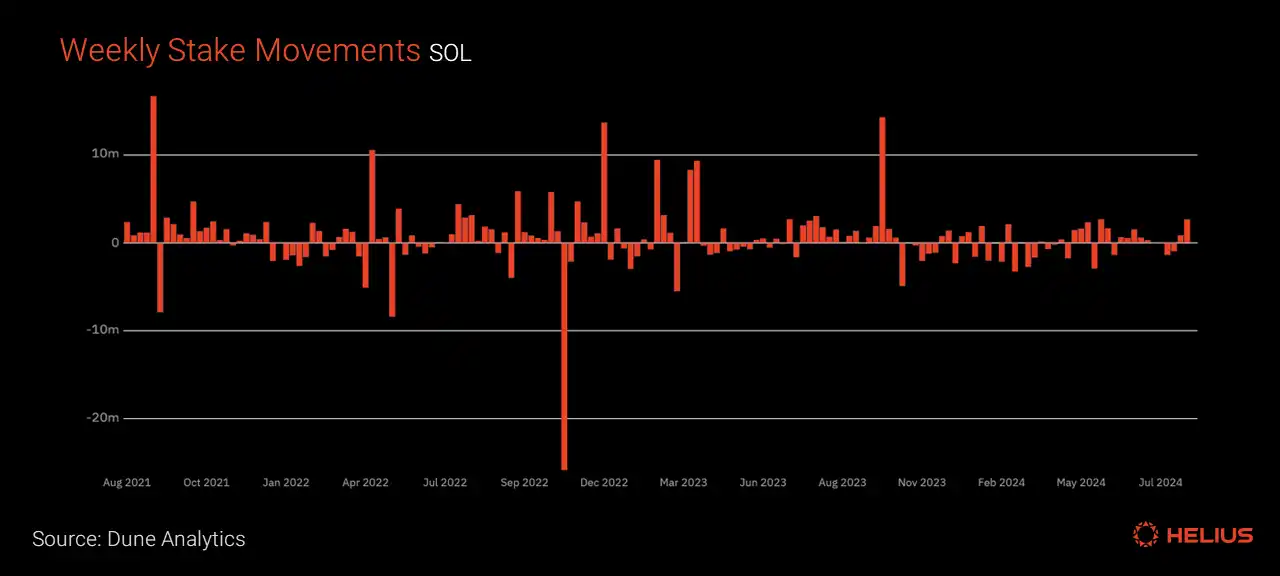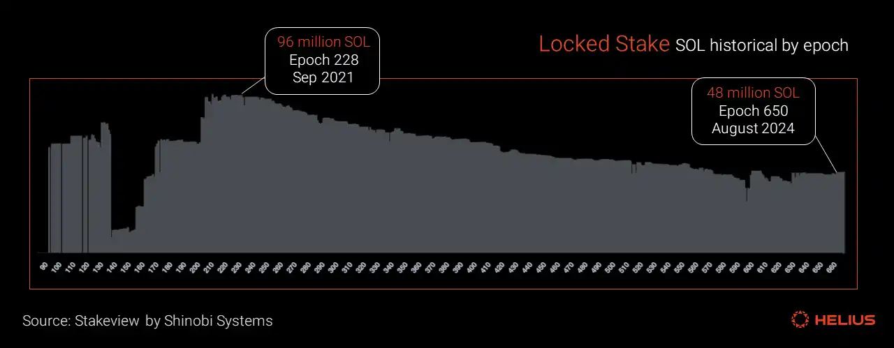 在过去的三年中,Solana 的锁定质押解锁速度相对稳定,从 2021 年 9 月的 9600 万 SOL 峰值下降到 2024 年 9 月的 4800 万 SOL,整体减少了 50%。