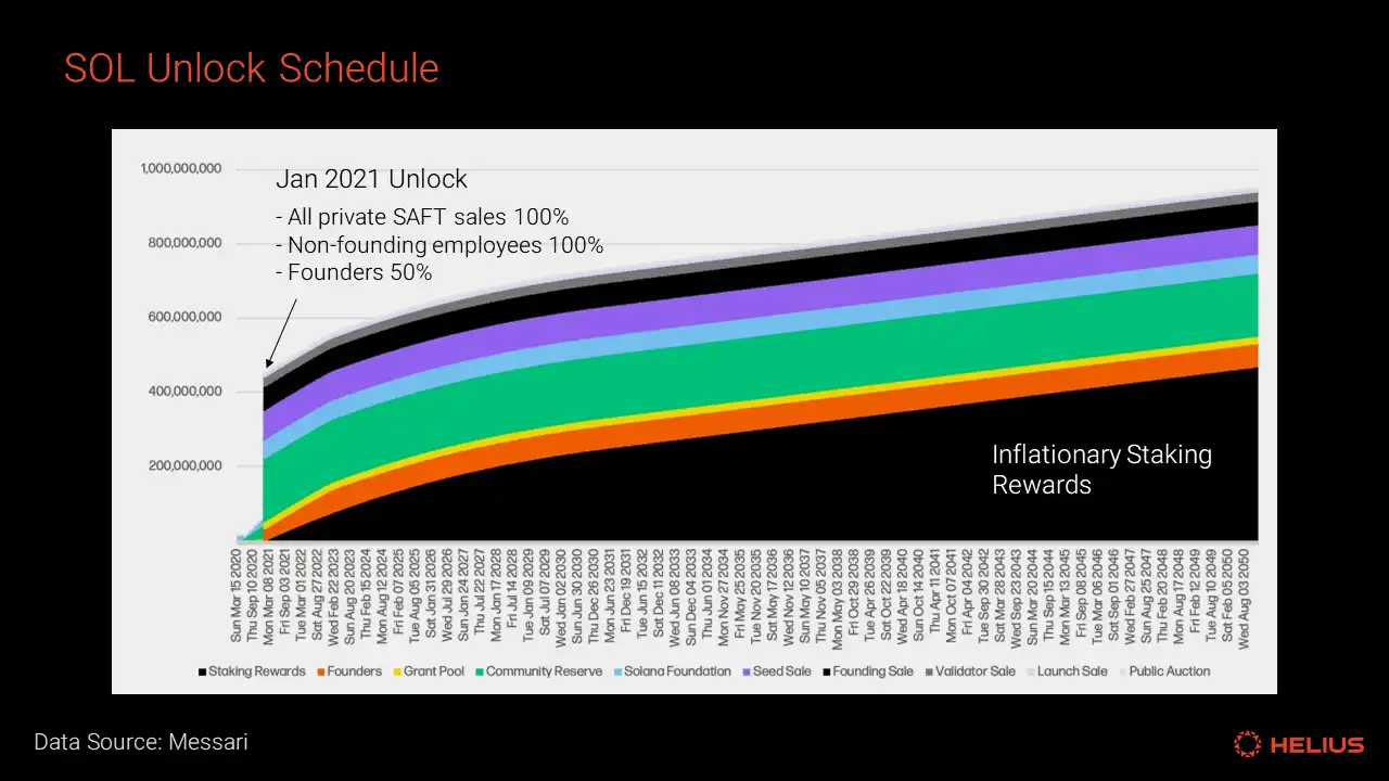 在这个最后的主要部分中,我们首先会简要量化剩余的非流通供应量解锁计划。然后,我们将讨论修改 Solana 代币发行的论点,包括「发行作为网络成本」的概念、通胀带来的税收低效、通胀的价格下行压力、对网络使用的惩罚性作用,以及替代验证者收入来源的兴起。之后,我们将探讨一些实际的方式来调整通胀计划并减少通胀。