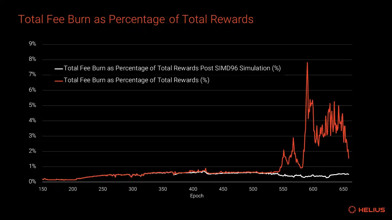 在 2023 年 12 月 14 日,总销毁费用占质押奖励的比例首次超过 1%,并在 3 月达到 7.8% 的峰值。在最近的 100 个 epoch 中,费用销毁平均占总质押奖励的 3.2%。在实施 SIMD-96 之后,销毁代币带来的通缩压力将变得微不足道。