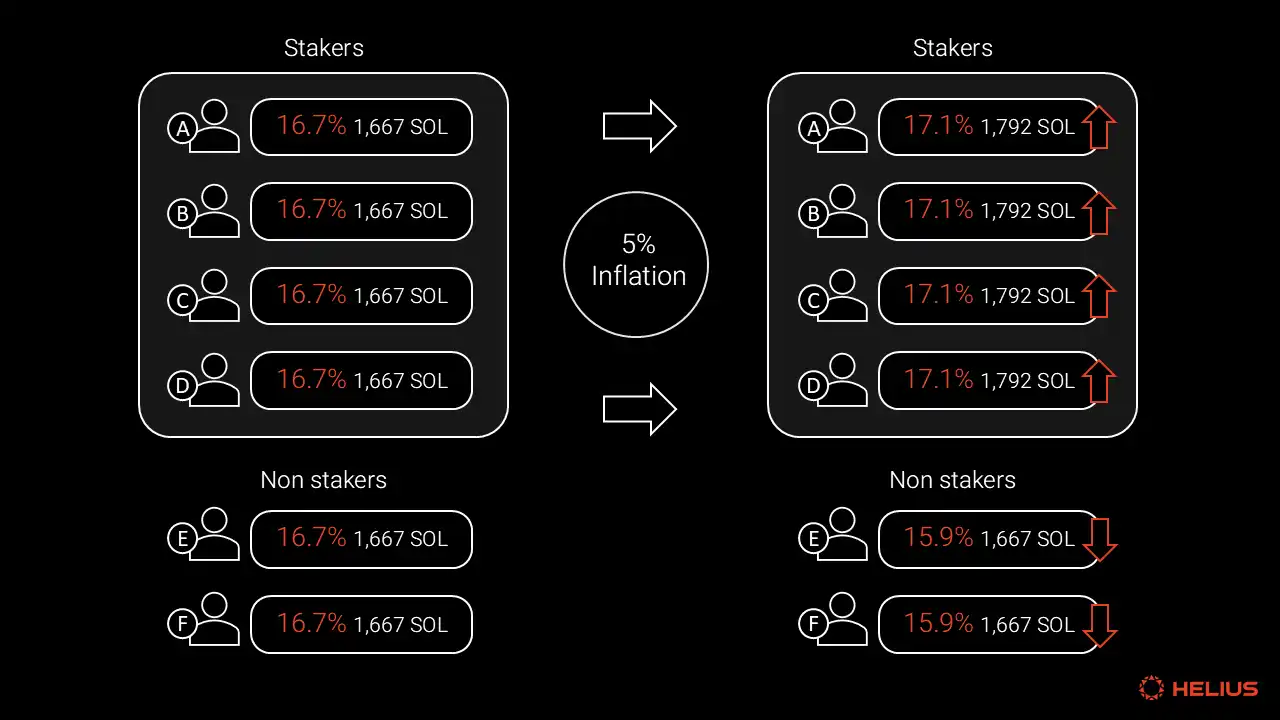 最初,每位用户持有 1,667 枚 SOL 代币,占网络份额的 16.7%,市值为 166,666 美元。在一年内,500 枚新代币将作为通胀奖励分发给质押者。一年后,四位质押者每人将拥有 1,792 枚 SOL 代币,名义上增加了 125 枚代币(7.5%),其网络份额增长了 0.4%,达到 17.1%。与此同时,两位未质押者的代币数量保持不变,其网络份额下降了 0.8%,降至 15.9%。假设网络的总市值保持在 100 万美元不变,那么每枚 SOL 的价值将从 100 美元下降到 95.23 美元。然而,每位质押者的网络份额总值将增加 3,968 美元(增长 2.4%)。相应地,每位未质押者的代币价值将减少 7,936 美元(下降 4.8%)。