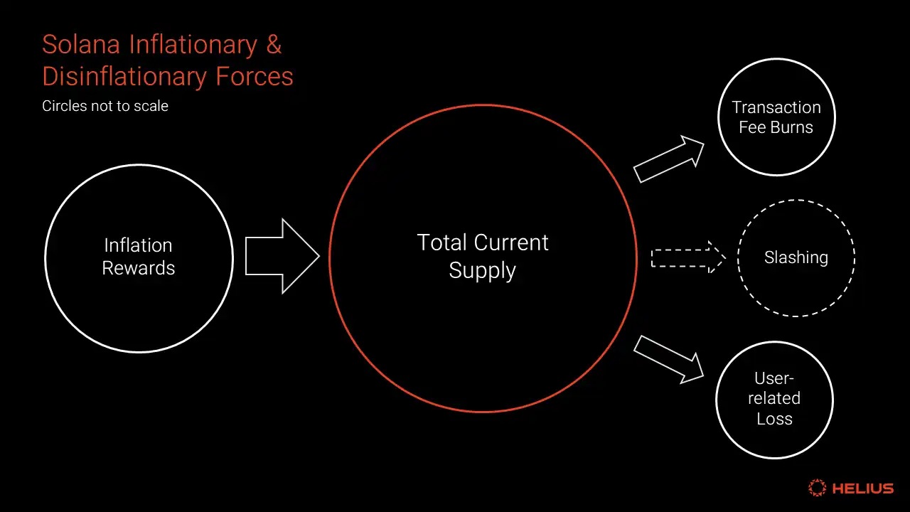 所有的 SOL 代币都来自两个地方:创世区块或协议通胀(也称为质押奖励)。相反,交易费销毁是唯一能够从流通中移除 SOL 代币的协议机制。