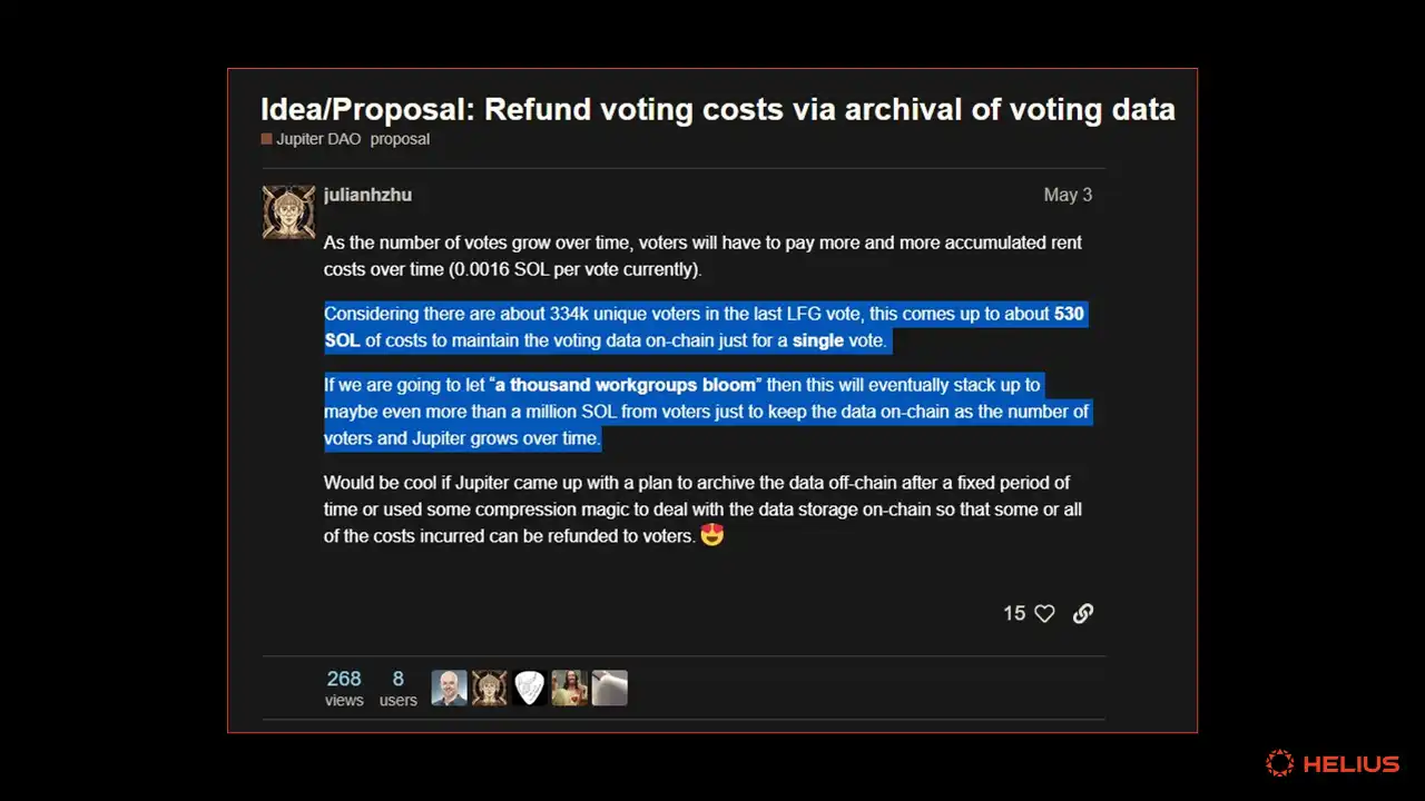 Jupiter DAO 论坛上的一篇帖子指出,大规模链上 DAO 投票导致高额租金成本的问题