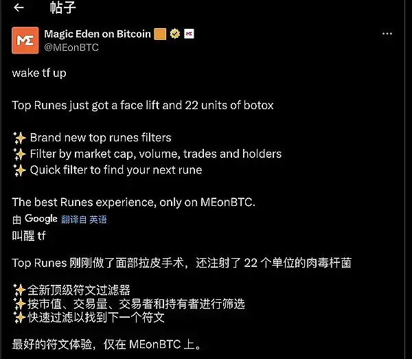 ● Top Runes 界面升级,全新顶级符文过滤器。按市值、交易量、交易者和持有者进行筛选。快速过滤以找到下一个符文。 @MEonBTC