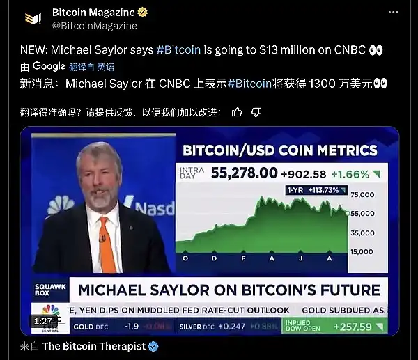 ● Michael Saylor 在 CNBC 上表示 #Bitcoin 将获得 1300 万美元。