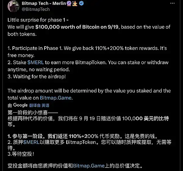 @BitmapTech 将会空投 10 万美金等值的 BTC,给所有用 BitmapToken 和 MERL 参与活动的人 1. 参与第一期活动,你的 BitmapToken 损耗我们将会给与 110%(首次损耗) 200%(日损耗)的奖励。这就是 0 成本的白嫖。2. 如果你投入了 MERL 到池子里,将会在每秒收到所有用户消耗 BitmapToken 的收入,边吃奖赏/边拿池子的收益。3. 等到 9/19 给所有参与者空投,共计 10 万美金。Jeff 补充道:这还只是 Bitmap 的第一期(420 万个 BitmapToken 和 10 万 u),这两个月 Bitmap 将会有 7 期。Merlin 生态的其他空投也在 incoming…)