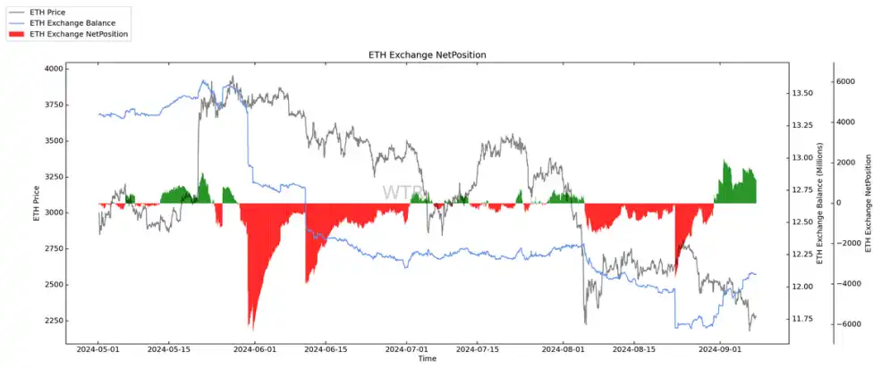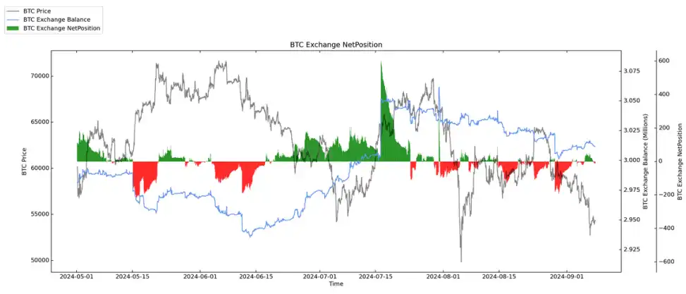 4. 交易所净头寸整体呈现 BTC 少量流⼊累积,ETH 中量流⼊累积。