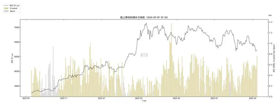 2. 筹码新增与销毁来看,目前处于大量筹码新增阶段;