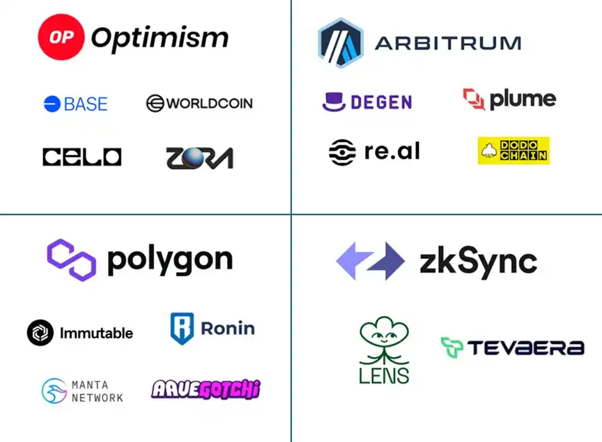 行业对齐举措包括通过开源 L2 技术栈(Rollup 框架)允许新玩家构建自己的链。这一波举措最初由 Op Rollup 通过 OP Stack 和 Arbitrum Orbit 的推出引领,其他成熟的 L2 如 Polygon(Polygon CDK)、ZK Sync(ZK Stack)和 Starkware(Madara Stack)也紧随其后,通过开源其专有技术推动大规模应用。