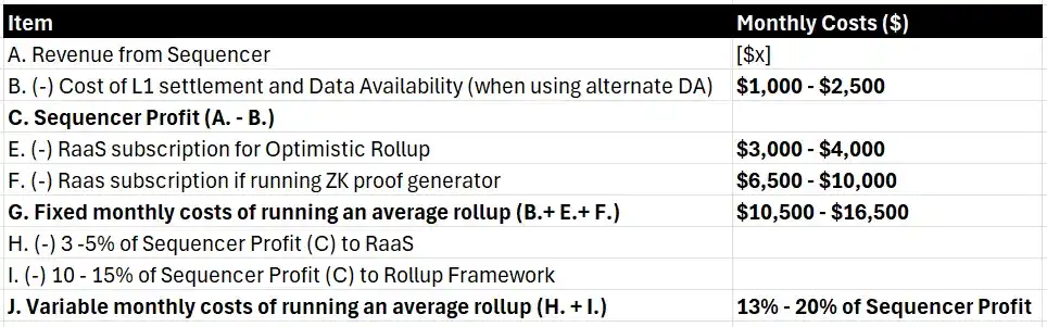 尽管在行业层面和个别链层面进行了各种优化,仍需要每月总计 10,500 至 16,500 美元的费用用于 ZK Rollup,以及 4,000 至 6,500 美元用于Op Rollup,此外一旦链开始盈利,排序器利润还需分享多达 20%。