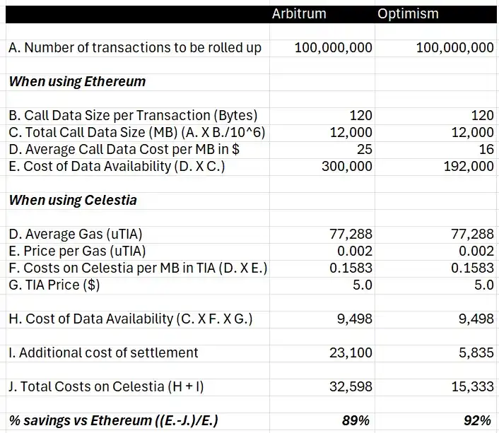 除了数据可用性成本之外,还存在结算成本,即 Celestia 在以太坊上发布标记,指向 Celestia 上的相关区块,以保证 Celestia 上发布数据的排序和完整性。