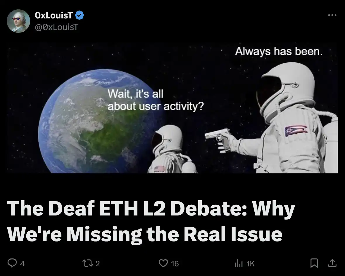 1. 关于以太坊和 L2 的辩论,我们忽略的关键一点是用户采用,@0xLouisT