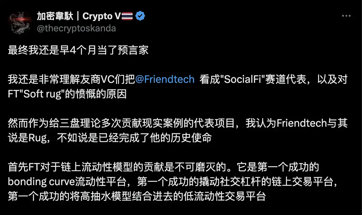 2. 关于 FriendTech 放弃合约控制权是因为其产品困境等观点,@thecryptoskanda