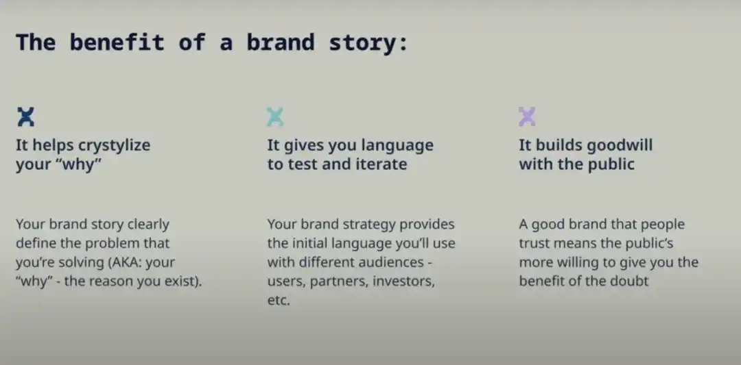 品牌故事还有第三个好处,它可以为你在公众中积累 goodwill(信誉)。这是一个备用的好处,但在最糟糕的情况下,出现危机时,如果你已经构建了一个稳固的品牌,拥有良好的声誉、公众信任和喜欢的品牌形象,那么在危机时刻,公众往往会更愿意给予你更多的信任和宽容。因此,拥有一个清晰的品牌故事是非常有价值的。