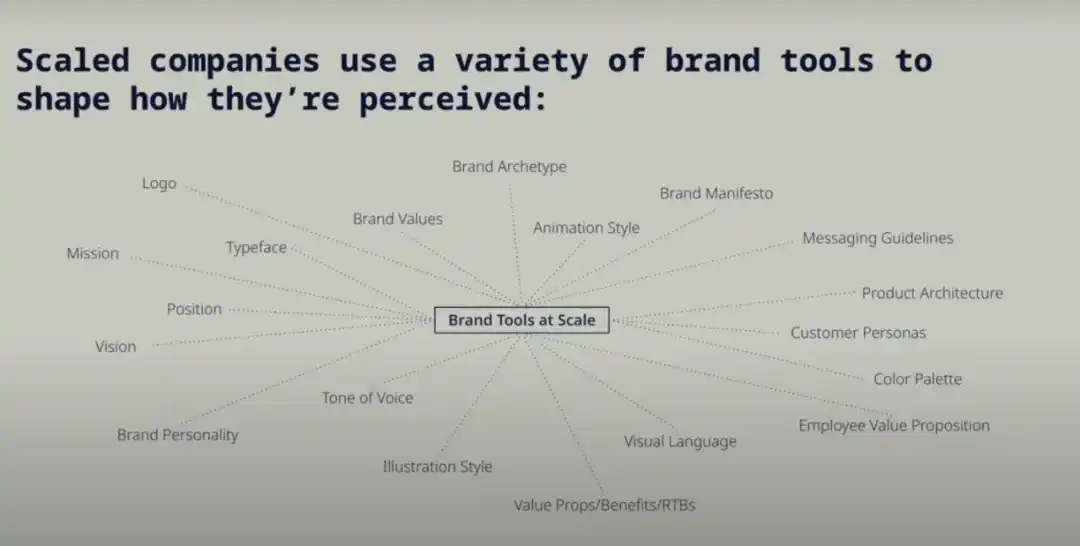 当你成为一家规模较大的公司时,你可以使用很多工具来管理品牌。这些工具包括视觉或语言等方式,帮助我们在市场中一致地传递关于我们是谁、以及我们希望被认为什么的信息。