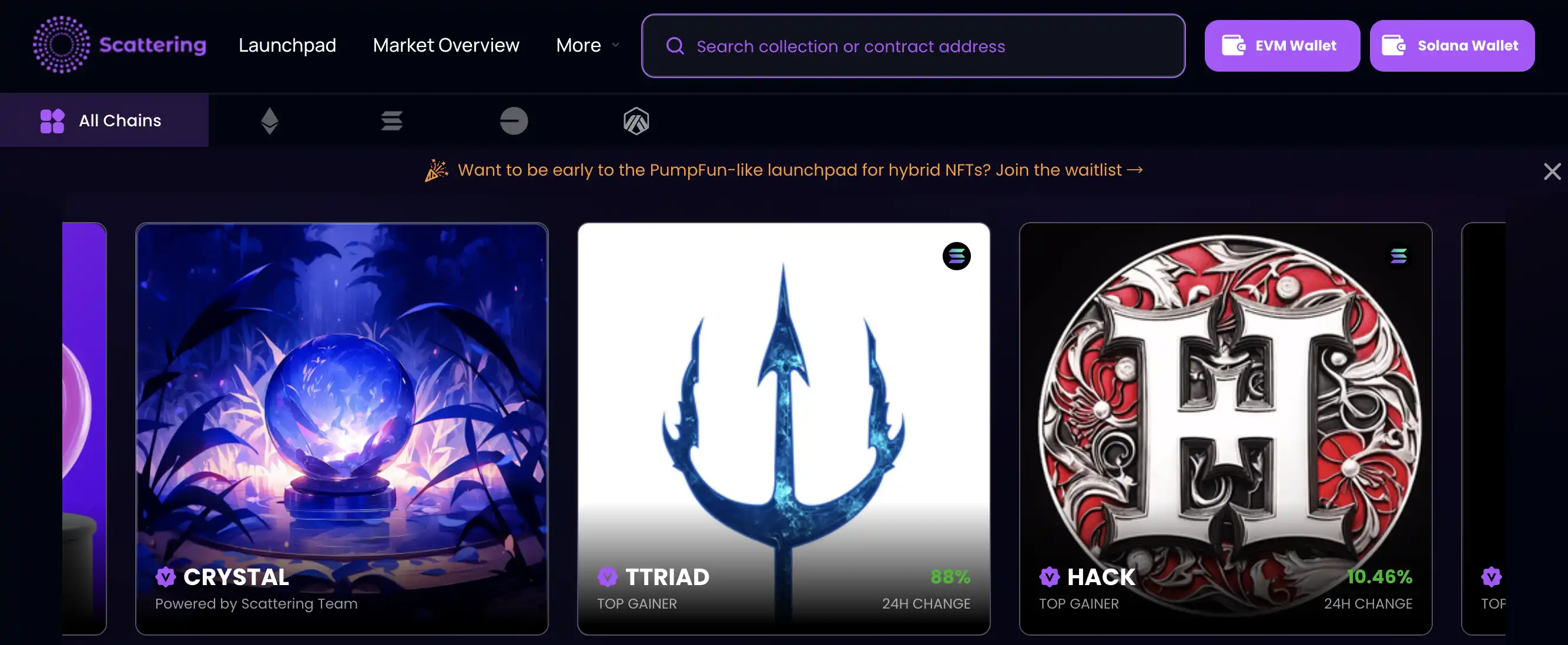 Scattering 是一个混合 NFT 的多链 bounding curve 启动平台,将推出包括 ERC404 、 DN404 和 SPL404 格式的 NFT。