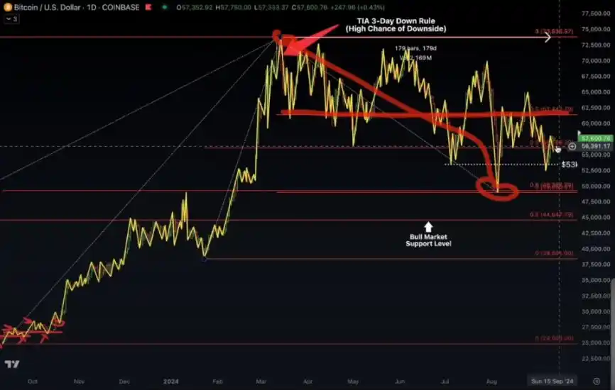 Pizzino 在 YouTube 节目更新中表示:「如果我们开始看到一些测试,并在短期内收于 58,000 美元上方,这可能是一个不错的早期反弹,接下来将测试我分析中更重要的水平 61,500 美元左右,这是 3 月至 8 月 50% 的调整幅度,这是比特币测试、克服和巩固的下一个关键水平,基本上是牛市的下一阶段,推向新的历史高点。」