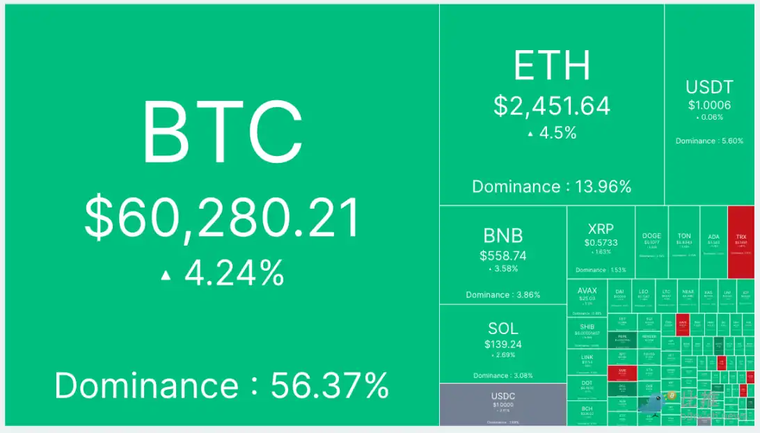 比推数据显示,当天早些时候,BTC 短线飙升逾 1,500 美元,从 58,000 美元跃升至 59,700 美元,在美股收盘后涨破 69,000 美元。截至发稿时,BTC 交易价格为 60,280 美元,24 小时涨幅 4.24%。