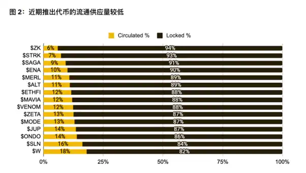 在整体普遍缺乏流动性的市场中,代币在 TGE(代币生成事件)后逐步解锁,给市场带来了大量的抛压。然而,VC 们真的在这轮市场中赚到钱了吗?其实未必。通常,合规且受监管的项目融资,代币解锁至少需要一年的悬崖期。然而,当项目具备高 FDV 和低流通性时,解锁后极易遇到破发的情况。但这并不排除某些小型 VC 通过二级市场倾销或提前场外出售获利的可能性。如下图数据显示,这些代币的流通供应⽐例普遍低于