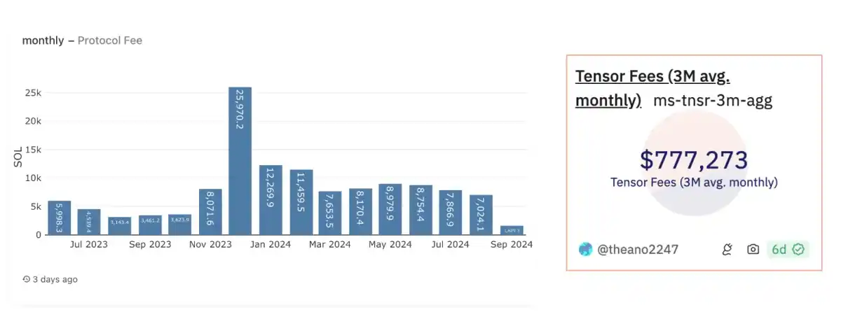 1、更高的费用收入:过去三个月,Metaplex 生成的费用与 Tensor 相当甚至更多,主要由于其在 NFT 和可替代代币领域的持续主导地位。尽管如此,$TNSR 目前的完全稀释估值(FDV)为 3.5 亿美元,显著高于 $MPLX。这种差异表明 $MPLX 相对于其创收潜力被低估,特别是在持续的回购计划的强力支持下。