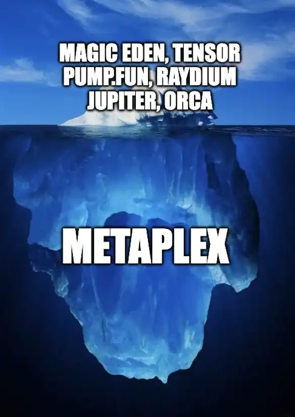 什么是伟大的企业?虽然可以从多种角度解答这个问题,但有一个明确的标志就是在不断增长的市场中占据主导地位。在 Solana 生态系统中,Jupiter 或 Pump.fun 等名字可能会浮现在脑海中,因为它们各自有着独特的优势。然而,Metaplex 是一个隐藏的巨头。尽管它鲜为人知,Solana 上 90% 的代币和 99% 的所有 NFT 都是通过 Metaplex 协议创建的。大多数用户甚至在付费使用 Metaplex 的服务时,尚未意识到他们与它的交互,这些费用随后被用于战略性回购其原生代币 $MPLX。现在,是时候将 Metaplex 视为 Solana 生态系统中的关键角色了。