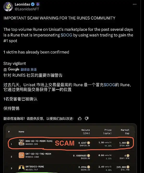 过去几天,Unisat 市场上交易量最高的 Rune 是一个冒充$DOG 的 Rune,它通过使用刷量交易获得了第一的位置。1 名受害者已被确认。保持警惕!