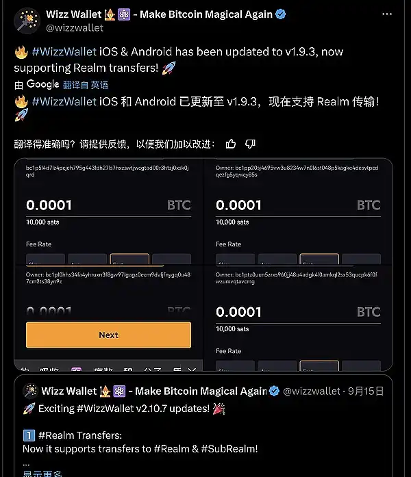● @wizzwallet iOS 和 Android 已更新至 v1.9.3,现在支持 Realm 传输!