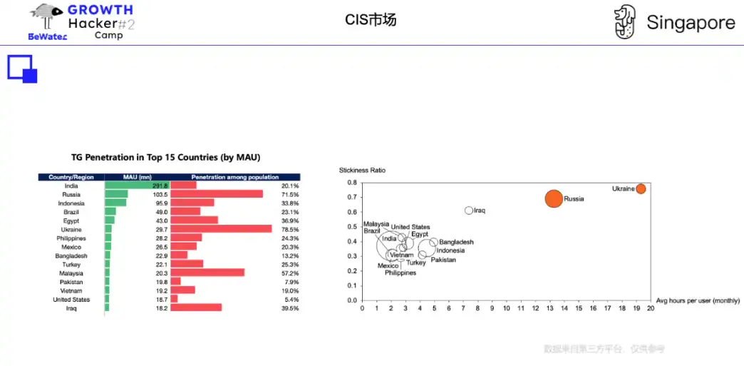 整个 TG 生态立的市场高地在 CIS 地区,俄语区的市场「高地」不光体现在用户数量,更是用户质量、用户使用时长、用户 commitment,这块市场是最值得做的。Notcoin、Dogs、Hamster 等明星 TG 项目来自俄语区,而 Catizen 已经做了很好的俄语市场融入。其他地区如印度虽然人数 MAU 最高,但是用户价值与渗透率均不高,另外,还有些市场比如伊朗反倒是值得关注。