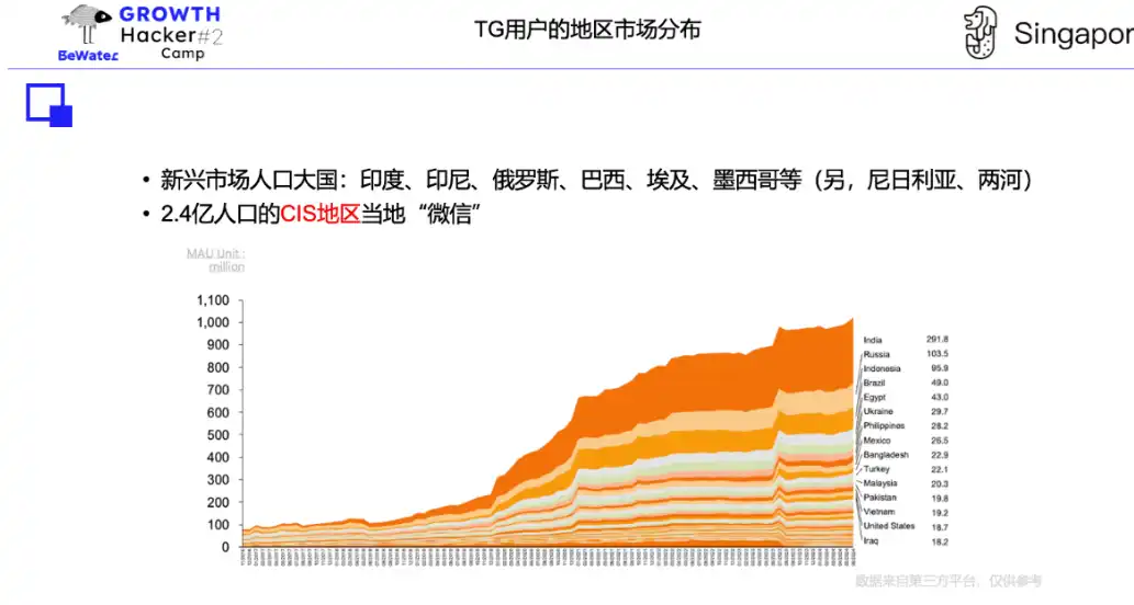 除发达国家之外,TG 是 2.4 亿人口的 CIS 地区的「微信」,另外重点市场包括印度、印尼、尼日利亚和伊朗等第三世界新兴市场的人口大国,Telegram 接近 10 亿的用户,其实 Crypto 用户比例还并不是那么高,在很多国家就是一个国民 IM 软件使用,而不是擦边、地下通讯软件。