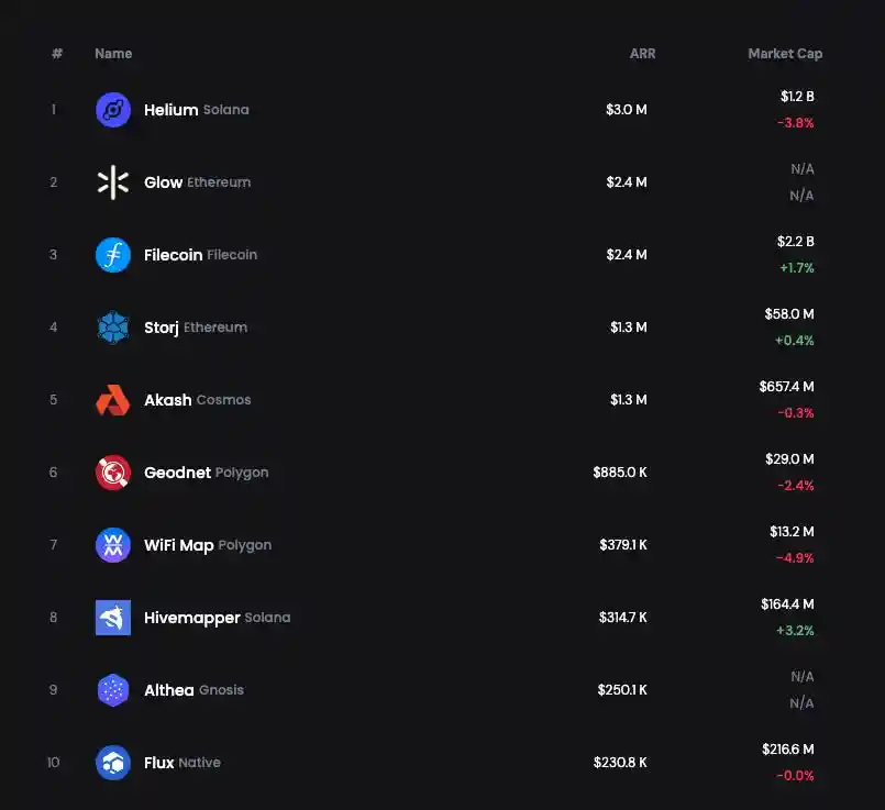 根据 depin.ninja 的统计,Helium 在近期收入生成方面排名第一。他们做了一些令人惊叹的工作,随着 2025 年减半的到来,观察收入如何上升将会很有趣。